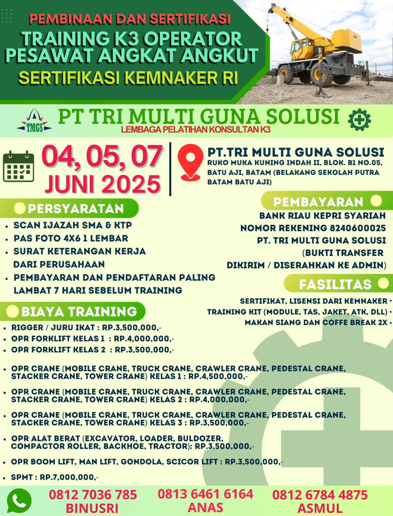 Pelatihan K3 Operator Pesawat Angkat Angkut ditujukan untuk membekali peserta dengan keterampilan dasar dalam mengoperasikan alat seperti crane, forklift, hoist, dan sejenisnya secara aman. Pelatihan ini mengikuti standar keselamatan dan kesehatan kerja (K3) yang berlaku di lingkungan industri dan proyek konstruksi.